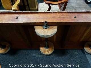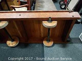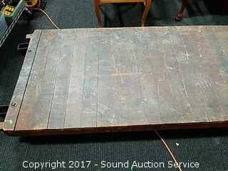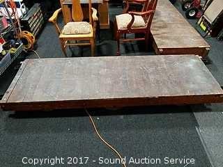 Has 3 axles, 6 wheels, center wheels are larger. Approx. 10.5" tall, 8 ft long, 29-3/8" wide.