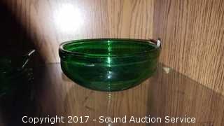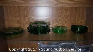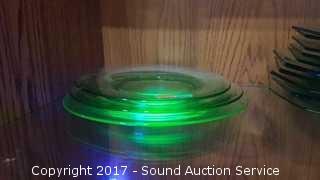 17 are vaseline glass. Also comes with a green bowl. 19 pieces total. Snack plates are 7", saucers are 5-1/4"