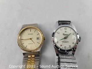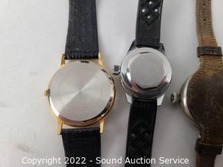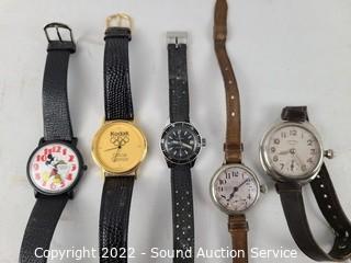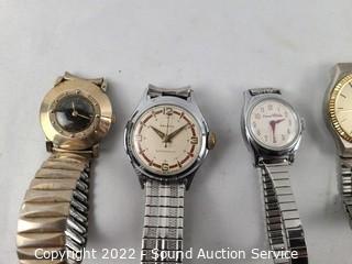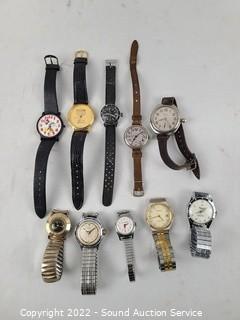 Lot Details: Chateau wind-up (works), Ingersol Wrist wind-up (wound tight), Baccard? wind-up (works), Medana quartz (works), Lucern Electra, Westclox wind-up (wants to run but keeps stopping), Snow White wind-up (doesn't appear to be functioning), Kodak quartz, Elgin wind-up (doesn't appear to be functioning), Lorus quartz Mickey Mouse.
