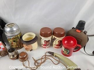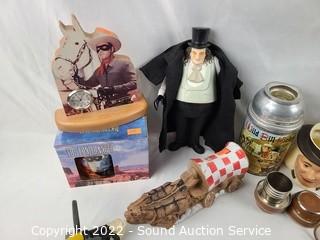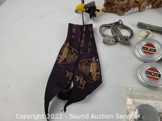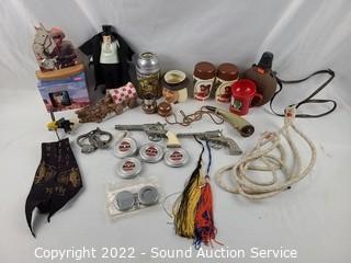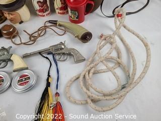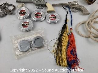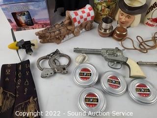 Lot Details: Batman Penguin figure, Annie Cups, Wild Bill Hickok Thermos (some damage), cap guns, kids metal handcuffs (work), Lone Ranger mug & more.