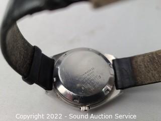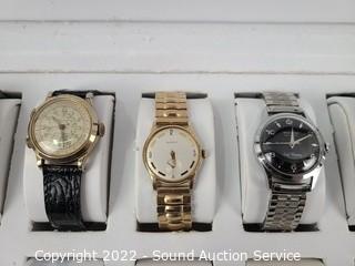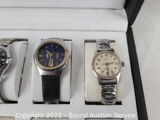 Lot Details: Case holds 24 watches. Watches include; Benrus quartz, Montreu Antimagnetic Wind-up (works), Caravelle Set-O-Matic wind-up (works), Tara Jeweled wind-up (works), Benrus wind-up (works), Westclox Self Winding (works), Citizen Quartz, Arta Shockproof wind-up (works). Case liner is deteriorating in places.