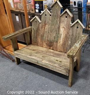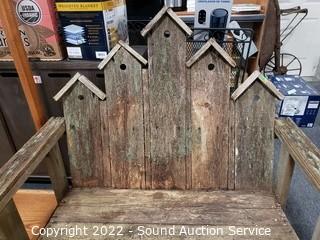Lot Details: Not actual birdhouses, just cut to look like birdhouses. 46" H x 49" W x 30" D x 13" to seat. Various weathering & wear.
