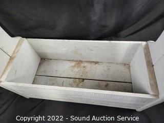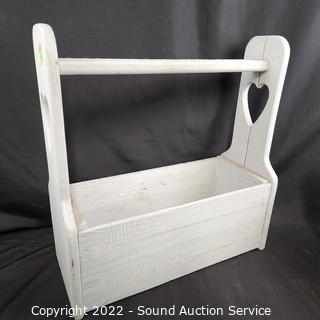 Lot Details: 10" H x 17" x 10" basket, 18" H x 17" x 7" wood tote.