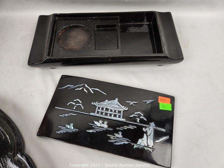 Lot #0176: Enameled MOP Vase, Trinket Box & Charge