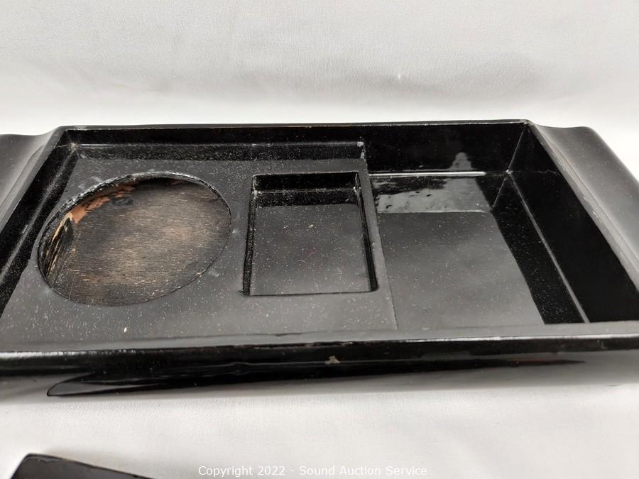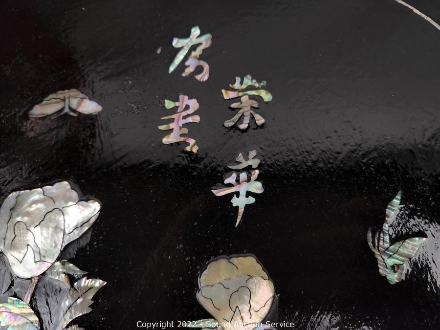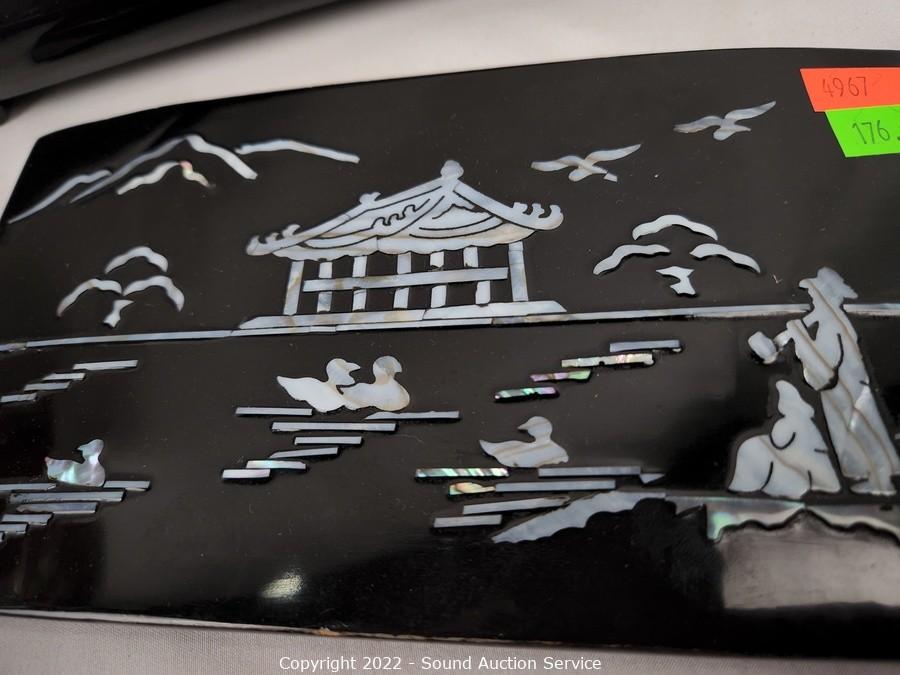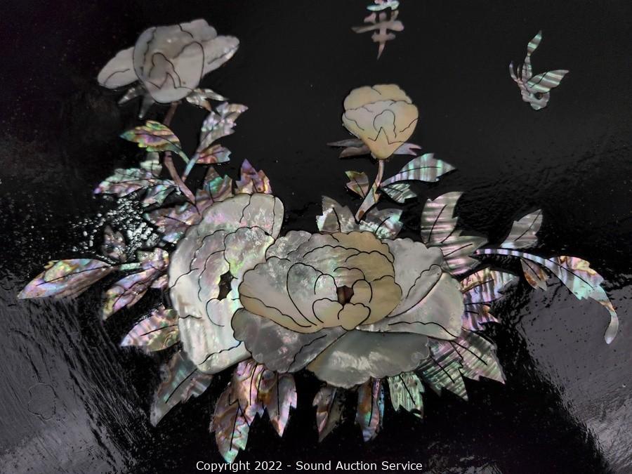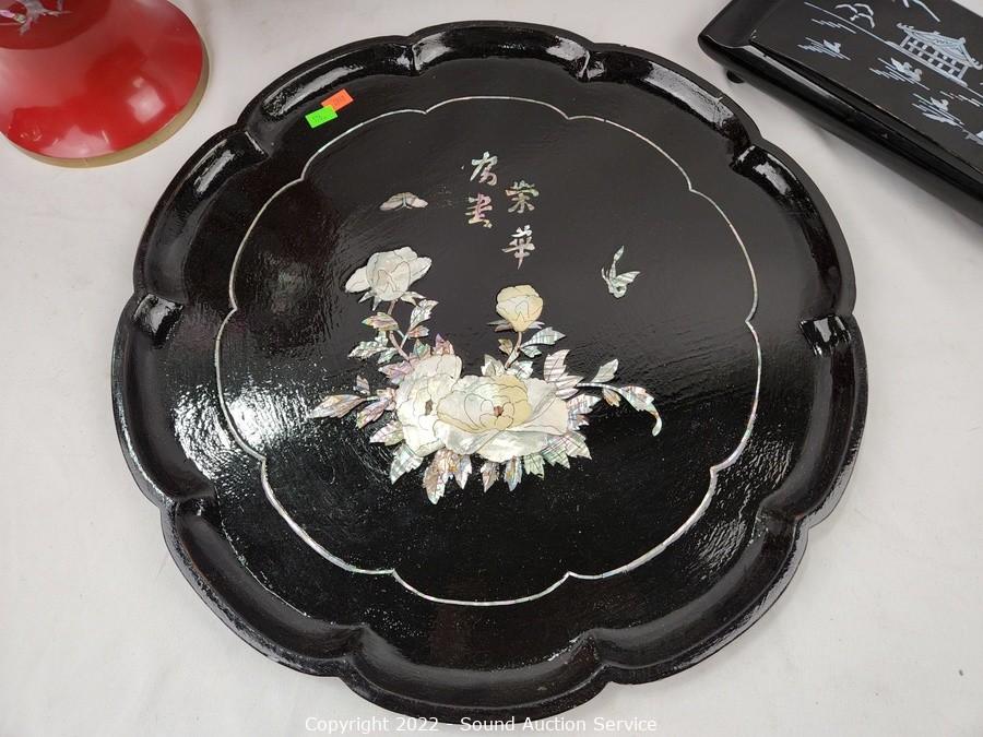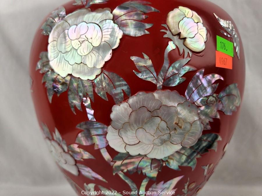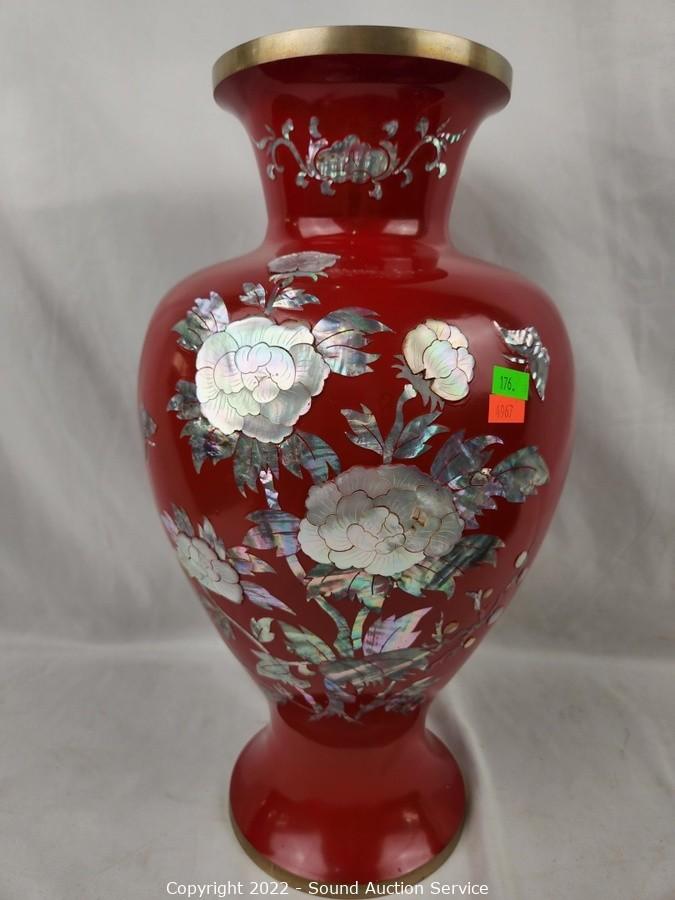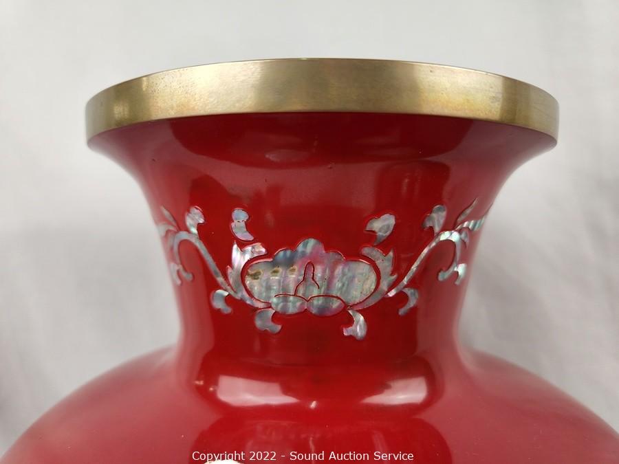 Lot Details: Red brass enameled MOP vase 17" H x 9" dia, 18" dia charger, 1.75" x 4.75" x 10.75"