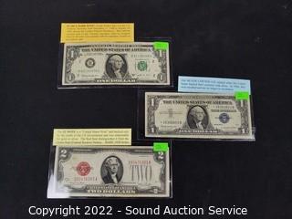 Lot #0228: $1 Scarce Barr Note, $1 Silver Cert. & $2 Note