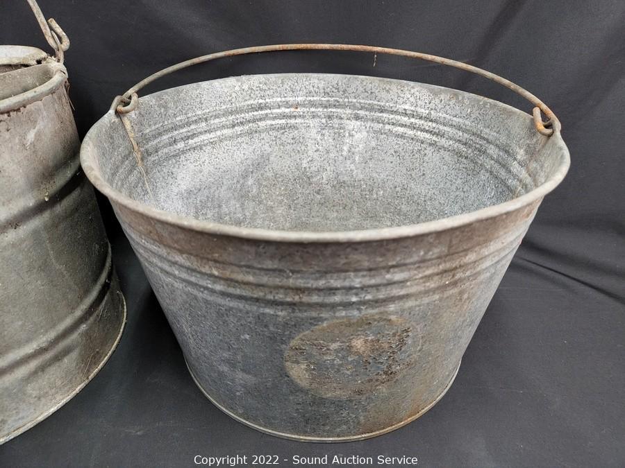 Lot #0177: 3 Vtg. Pails, Mop Bucket & Miniature Garden Tools