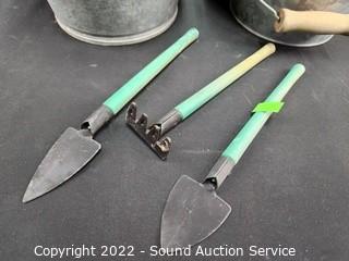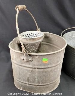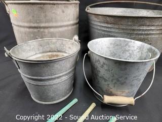 Lot #0177: 3 Vtg. Pails, Mop Bucket & Miniature Garden Tools