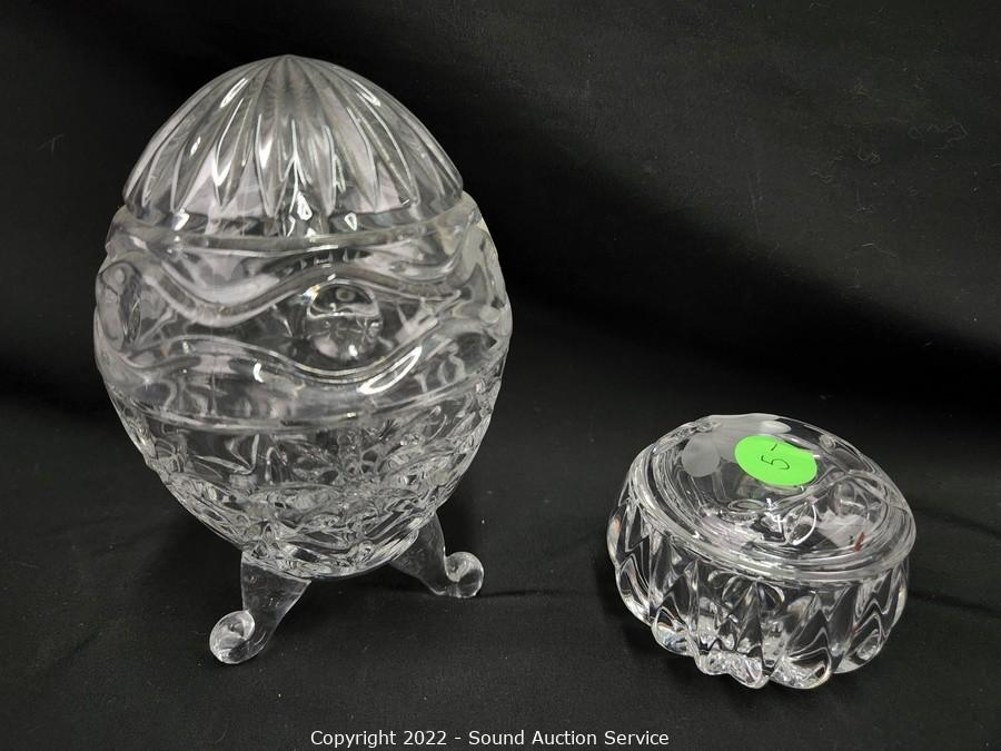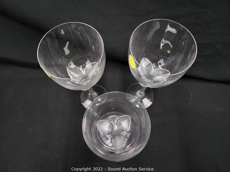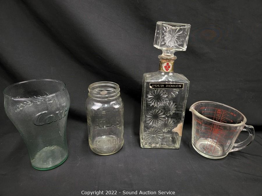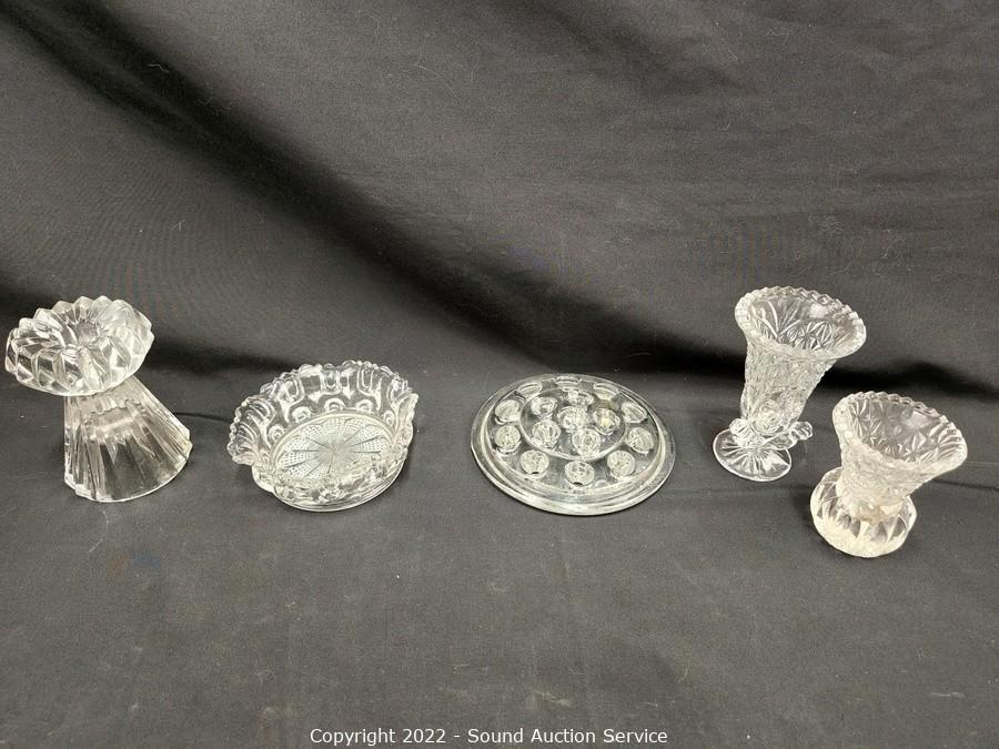 Lot Details: Vases, measuring cup, flower frog, stemware, cruet, decanter & more.