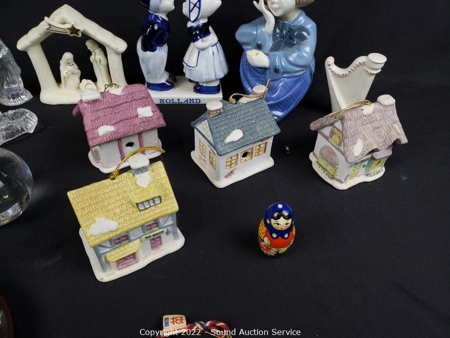 Lot Details: Ceramic ornament cottage bells, seashell trinket box, bobble head, incense jar, glass figures & more.