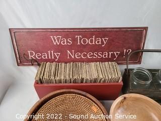 Lot Details: Box of quotes, tin sign, stone vase, metal art bird, woven baskets and more.
