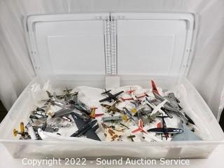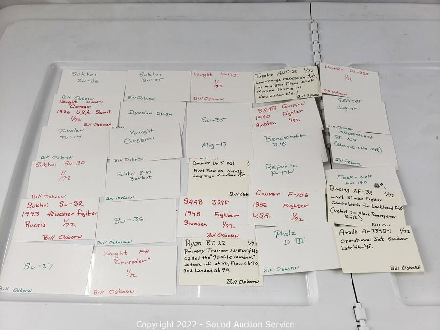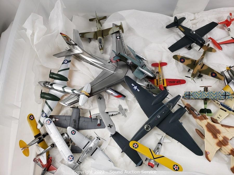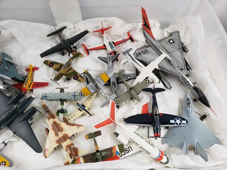 Lot Details: A few with broken pieces. All or most 1/72. Comes with tote they are stored in, 6" H x 38" x 22". Comes with some cards with models written on them, unsure if they match with planes inside.