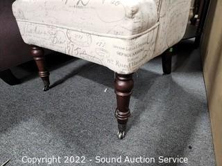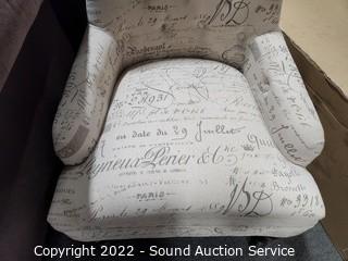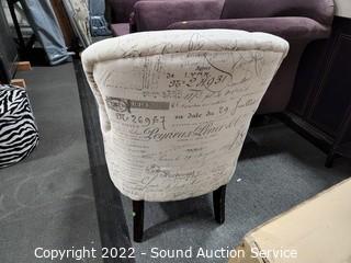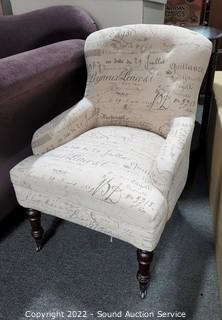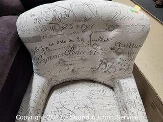 Lot #0006: Script Printed Fabric Button Tufted Accent Chair