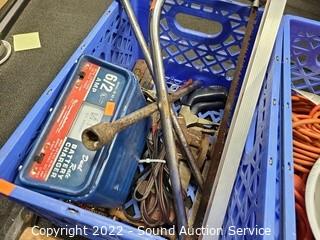 Lot Details: Canvas bag marked Bashlin Industries, sledgehammer, battery charger, extension cords, various hand tools, hacksaw, lamp & more.