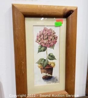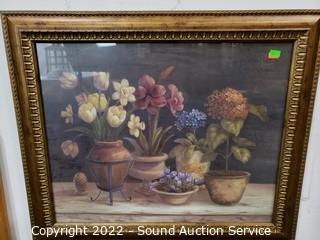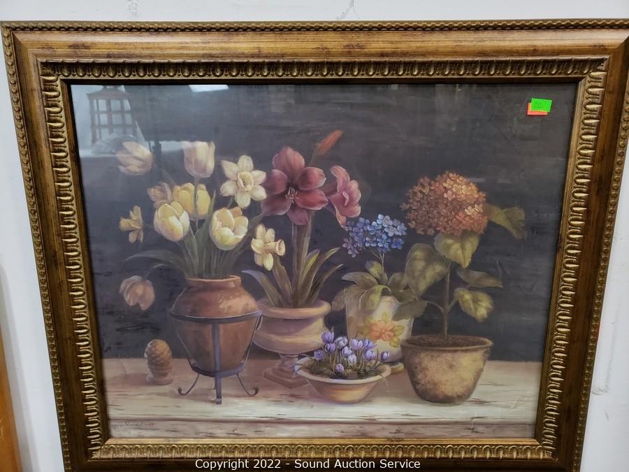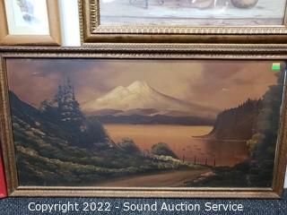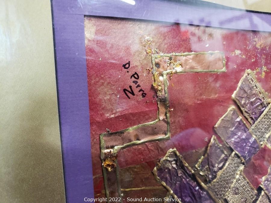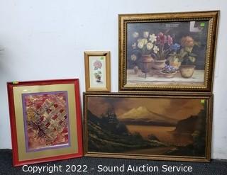 Lot Details: D. Parra original collage, 18" x 22". Original valley mountain scene (don't see a signature), 18" x 34". 2 floral prints, 7" x 11" & 24" x 20".