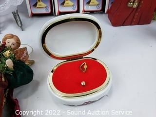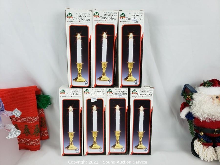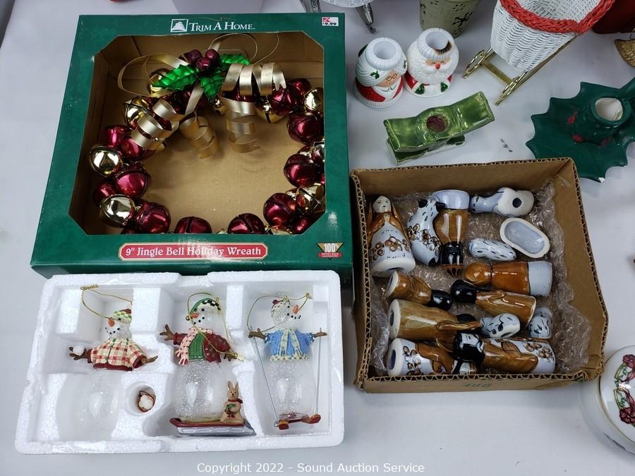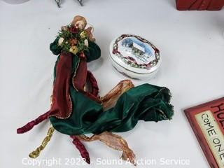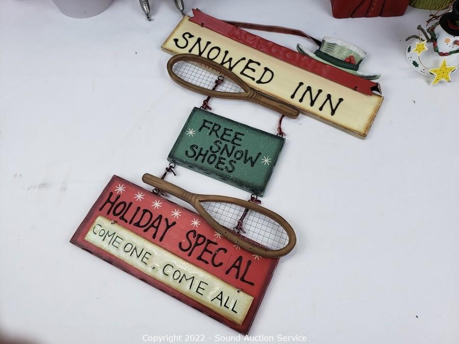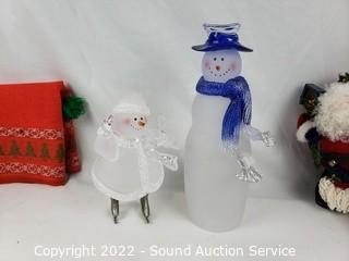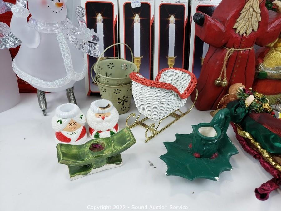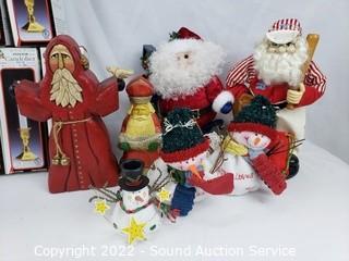 Lot Details: Santa figures, wall decor signs, candolier lights, glass snowmen, trinket box & more.