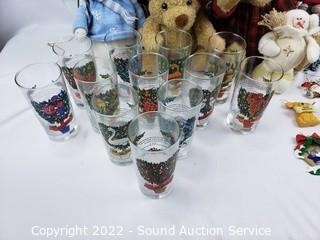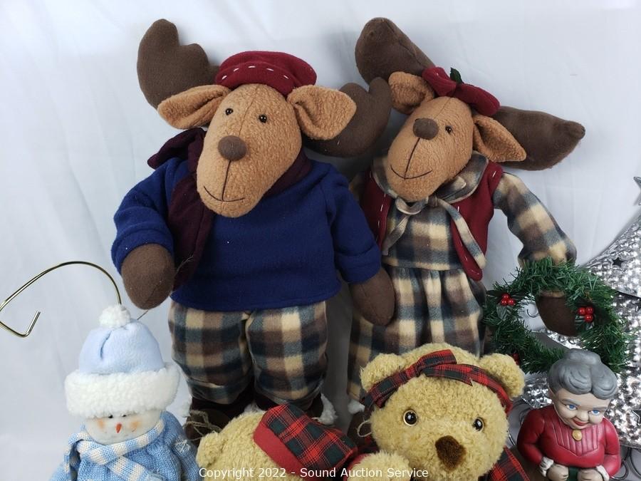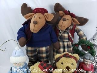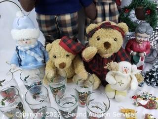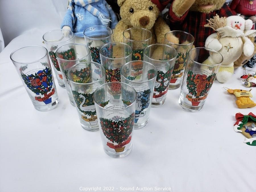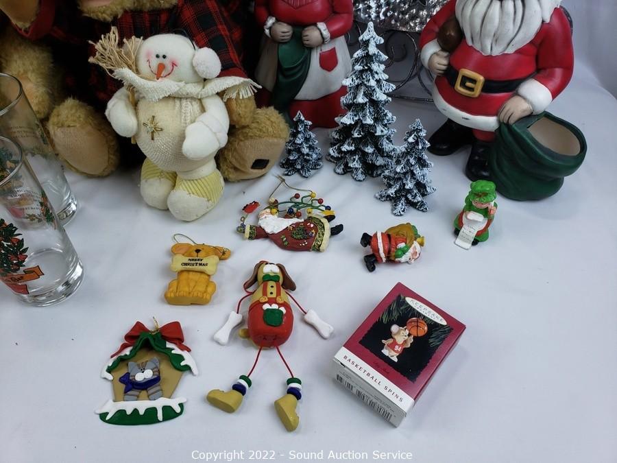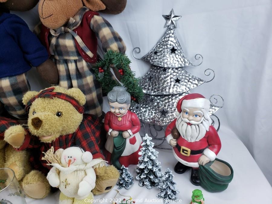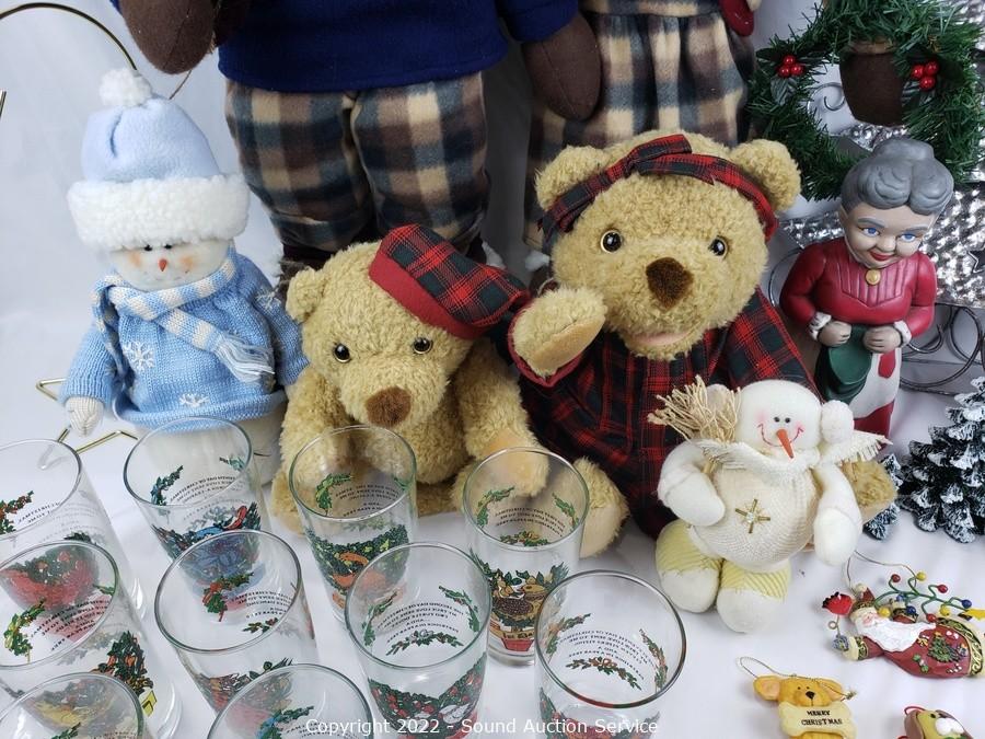 Lot Details: Metal tree decor, 12 days of Christmas tumbler set, Snowman, plush dolls, ornaments & more.