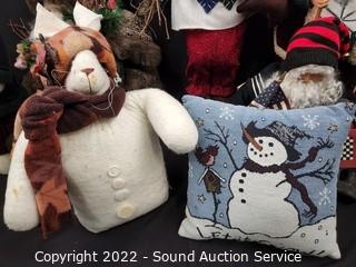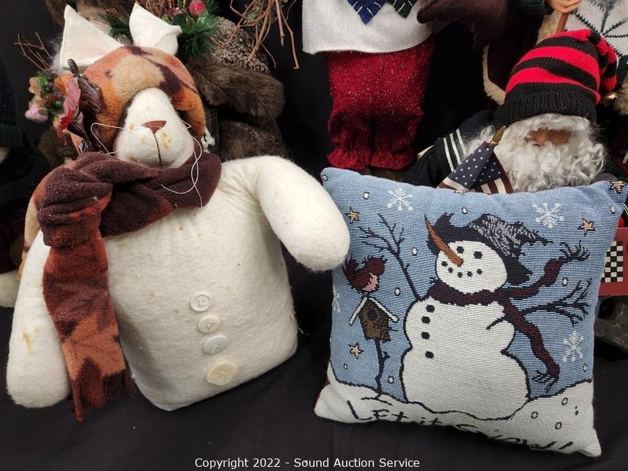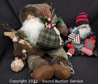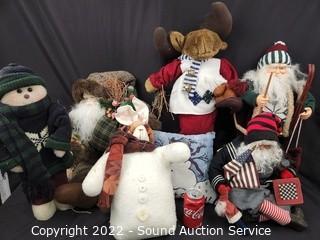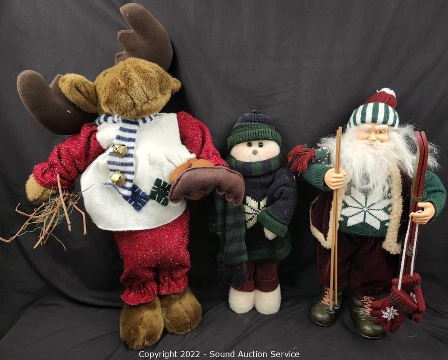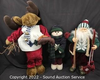 Lot Details: Santa's, Snowman, Moose, Rabbit. One Santa has a makers mark Dee Barr. Approx. 13" to 26" tall.