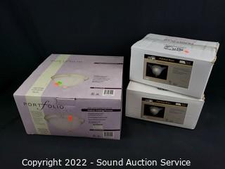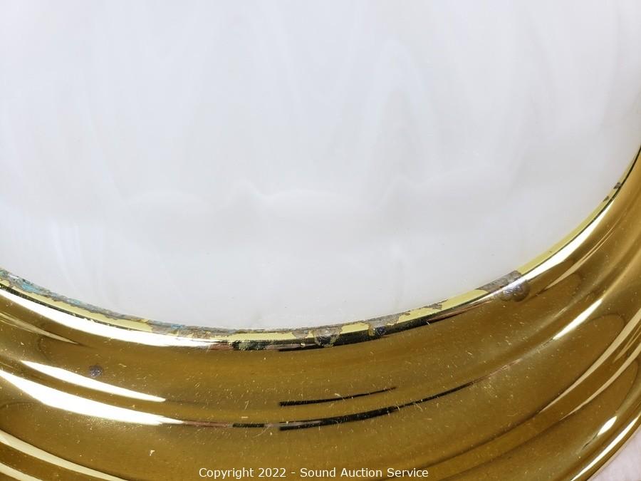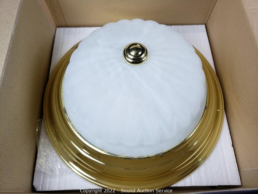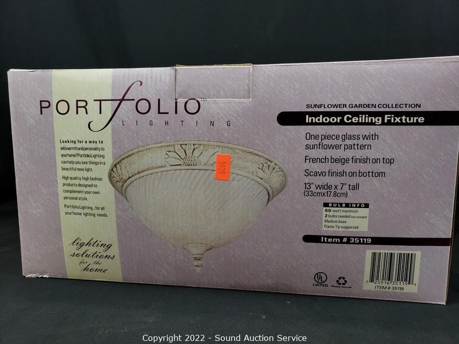 Lot Details: 2 Hampton Bay Polished Brass wall sconces lights, 6-1/4" H x 9-3/8" W x 4" E. Portfolio 7" x 13" French beige finish with sunflower glass shade. All work.