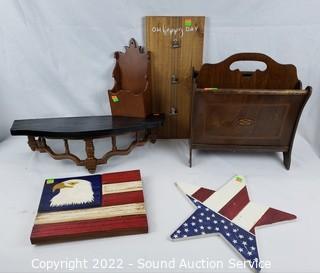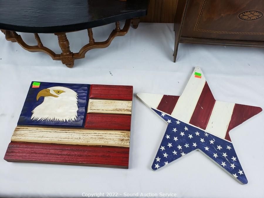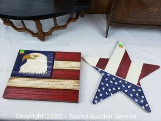 Lot Details: 21" x 8" shelf, 9" x 11.5" American eagle flag, wall decor, 14" American flag star, 14" H x 13" x 7".