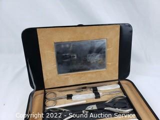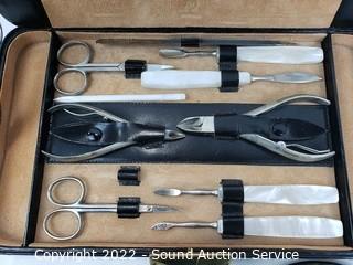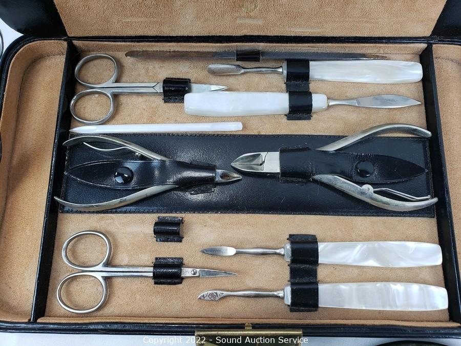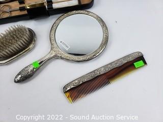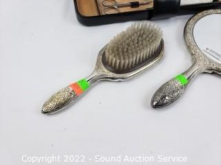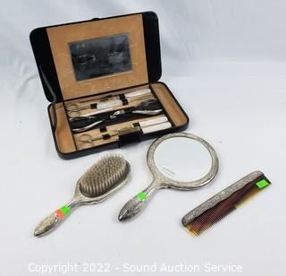 Lot Details: Comb, Brush, Hand Mirror vanity set. Manicure set appears complete.