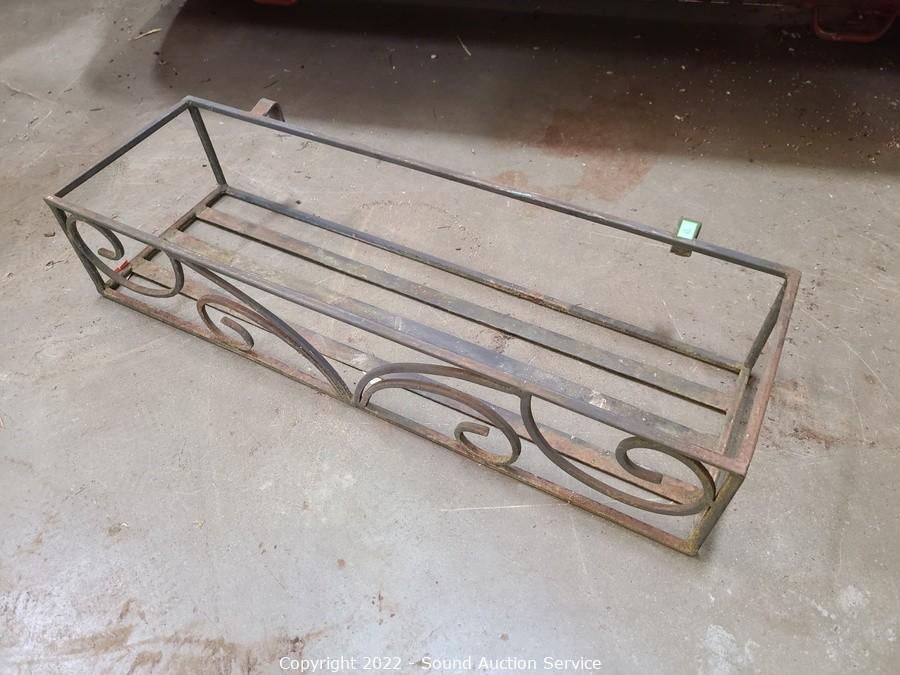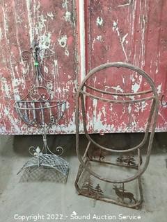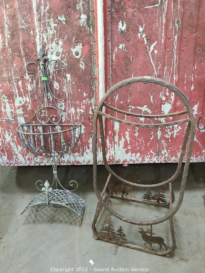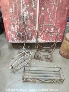 Lot Details: 5" H x 24" x 7.5" planter basket & 32" H x 13" W x 6" D hose hanger, 20" H x 10" Dia candle lantern, 28" H x 14" x 9" rack. Some weathering & wear.