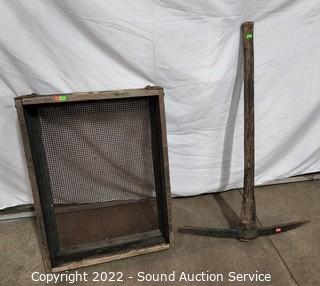 Lot #0103: Rustic Soil Sifting Screen & Pickaxe