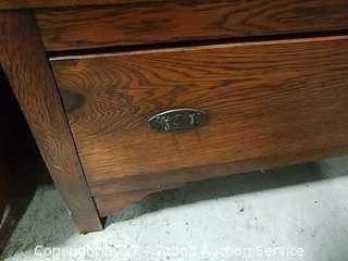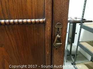 Antique Mirrored Armoire A couple flaws, one of the draw pulls is missing the handle, and a piece of the bead work trim is broken/missing. Beveled mirror. The handle on the door also turns to open latch. No keys. Approx. 79" tall, 39" wide, 15" deep.