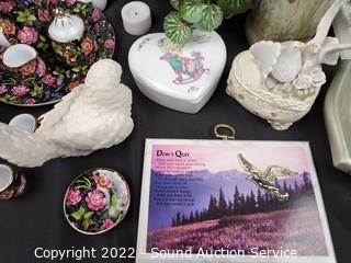 455:Lots including; Drexel 6-Chair Dining Set, Decorative Table Lamps, Vtg Mersman 3pc Mahogany Nesting Table Set, Saddle Seat Sedona Solid Wood Stools, Cast Iron Base Wood Slat Garden Bench, Assorted Lawn & Garen Decor, Cherry Finish Hutch, White & Gold Queen Bed w/Serta Mattress, Brass Queen Bed w/Sterns & Foster Mattress, Gray Distressed Finish 3-Drawer Hutch, Tents, Various Artwork, Various Sound Equipment mic/Line Mixers, Amplifiers, Speakers, Various Candles, Votives, Holders, Laser Disc Player, Pfaff 1222E Electronic Sewing Machine, Bulk Food, KitchenAid Counter Top Mixer, Assorted Canned Goods, Seraphim Angel Figures & Decor, Ladies Footwear, Evening Gowns, Jackets, Faux Houseplant Decor, Hummingbird Decor, Jewelry, Collectible US Coins, Patio Furniture & So Much More!!!