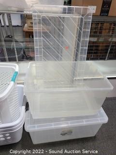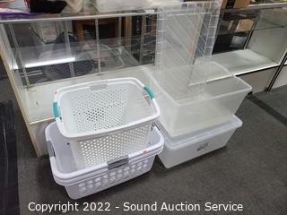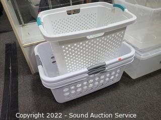 Lot Details: 12" H x 17" x 24" laundry baskets, 22" H x 16" x 20" hamper, 12" H x 16" x 25" totes.