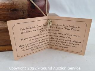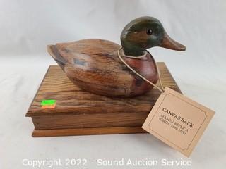 Lot Details: Comes with plastic bill chips, playing cards. Canvas Back Mason Replica carved duck box. 7" H x 10" x 5.5" overall.