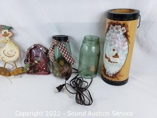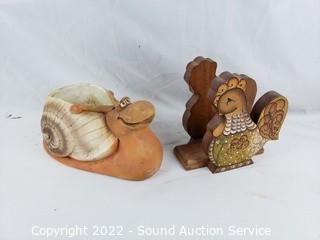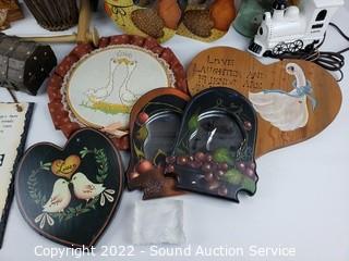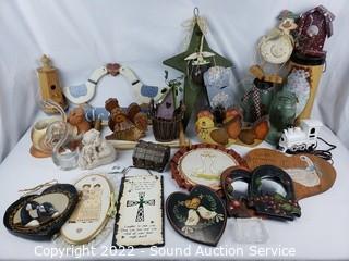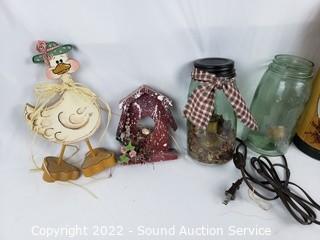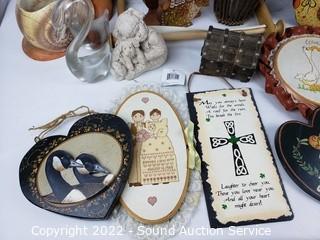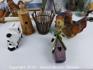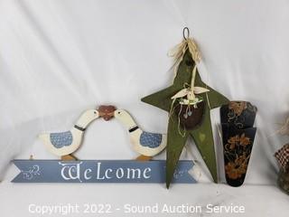 Lot Details: Wood Welcome sign, hand painted wood vase, coin bank, glass swan sculptures, other wood decor & more.