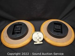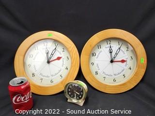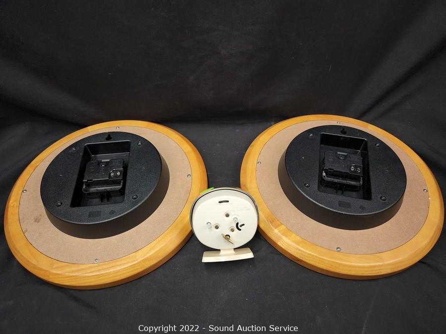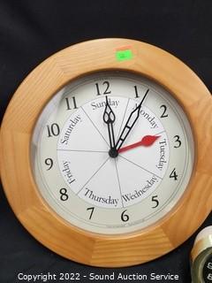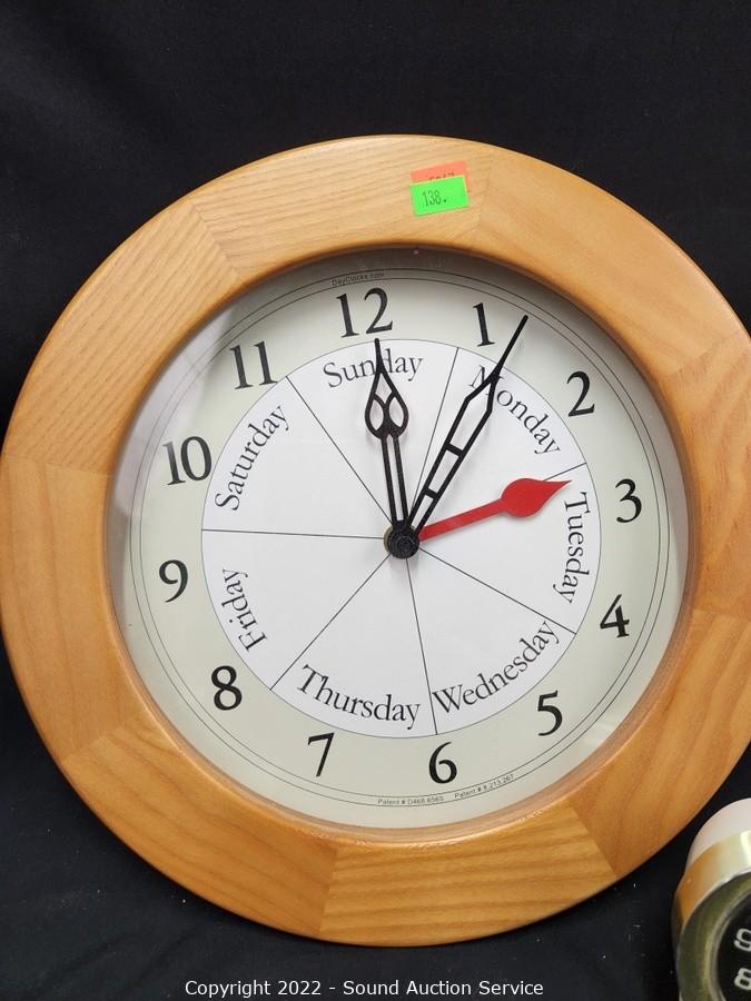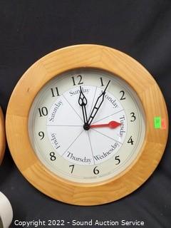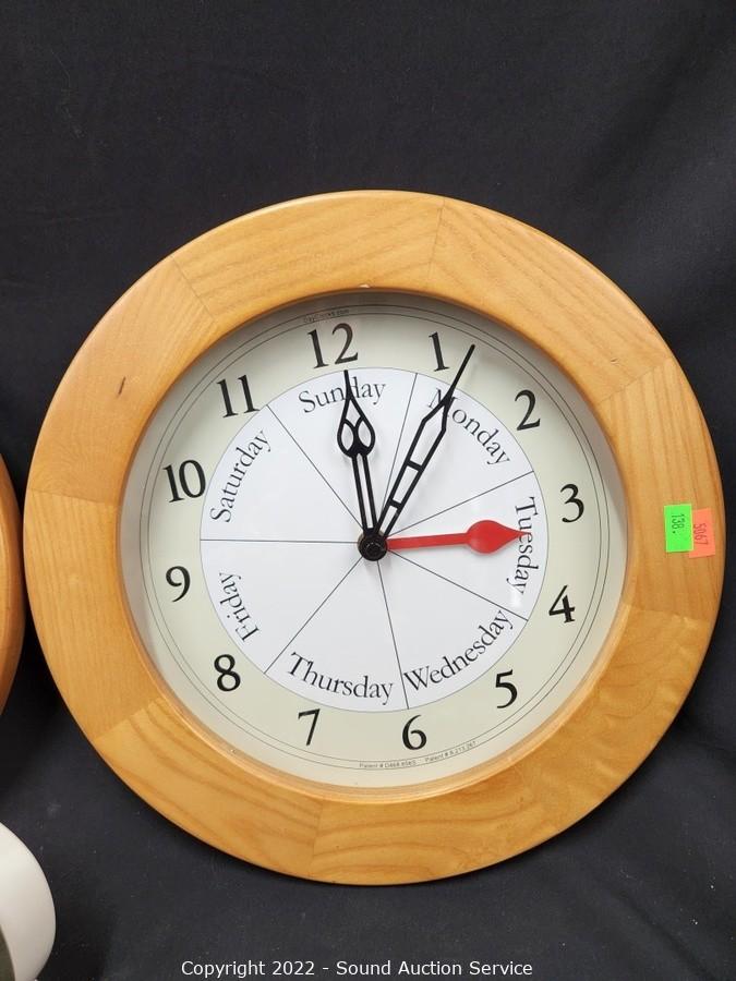 Lot Details: Baby Ben & 2 Wood Framed "Day Clocks" 12" Dia.