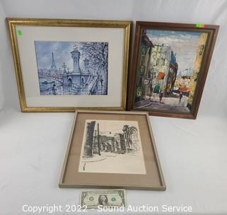 Lot Details: Bubley? signed oil on canvas, 14" x 18". J.Cherigon? oil painting? of Paris, 18" x 22". R.D. Wilson '63 sketch, 15" x 18".