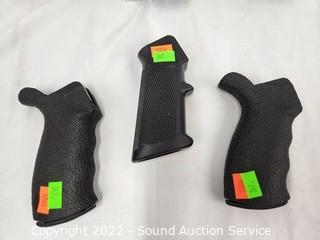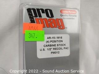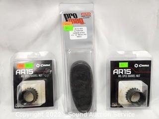 Lot Details: Pro Mag AR-15/M16 4 position carbine stock US 1/2" recoil pad model PM012, Hand Guard slip ring kit for AR15, 3 grips (2 are Blackhawk) and 2 Mil-spec barrel nuts for AR15. All appear new in original packaging.
