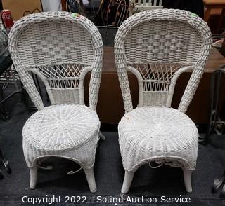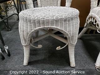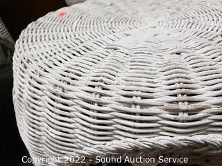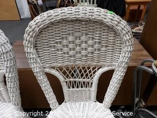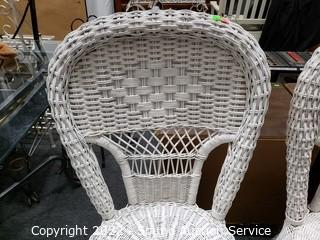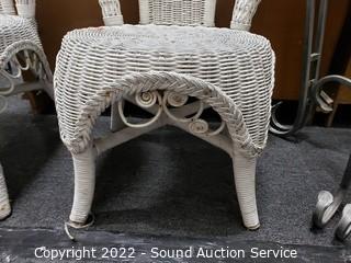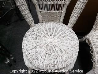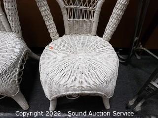 Lot Details: Paint is flaking in places, one leg has loose wicker. 38" H x 17" W x 16.5" to seat.