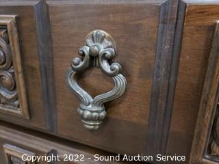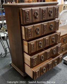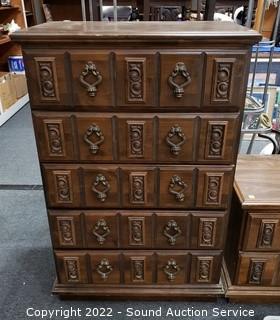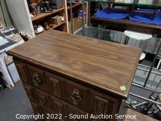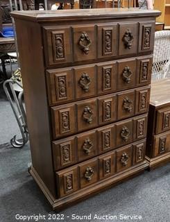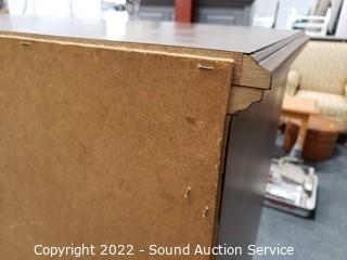 Lot Details: Veneer finish, particle board & wood construction. Matches the next lot. One of the molded plastic accent piece on the front is damaged, comes with piece in the drawer. 47" H x 37.5" W x 17" D.