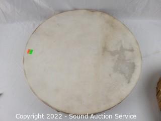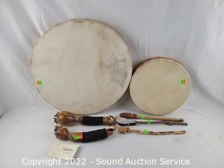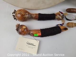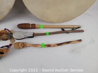 Lot #0063: 2 Handcrafted Native Drums & Bull Kelp Rattles