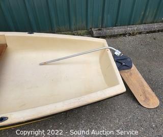 Lot Details: Approx. 11ft x 3'6" body, 13'3" x 8ft sail, appears complete, no major issues, some cosmetic wear, weathering, overall good condition. 350lb capacity.