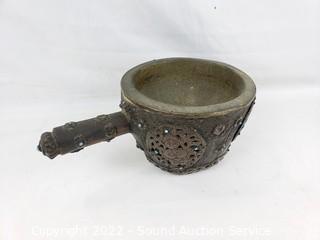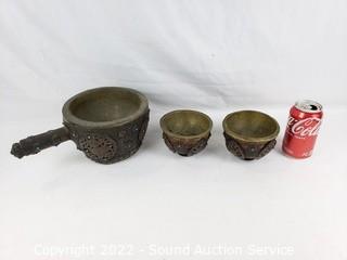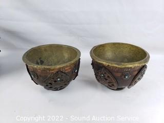 Lot #0334: 3 Primitive Wood & Metal Wrapped Vessels