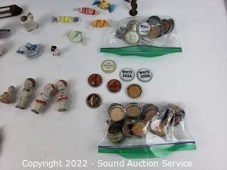 Lot Details: Stone eggs, bottle caps, figures, matches, and various other trinkets. Refer to photos for lot contents.