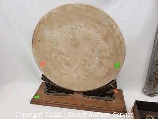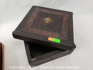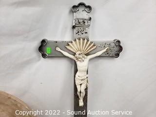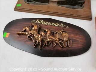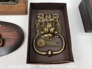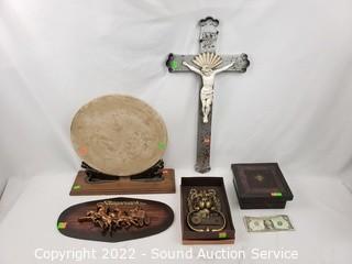 Lot Details: Jesus cross, lion head door knocker, stage coach wall decor, carved wood trinket box, pizza stone with stand.