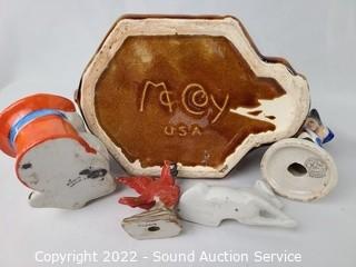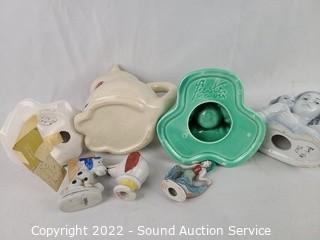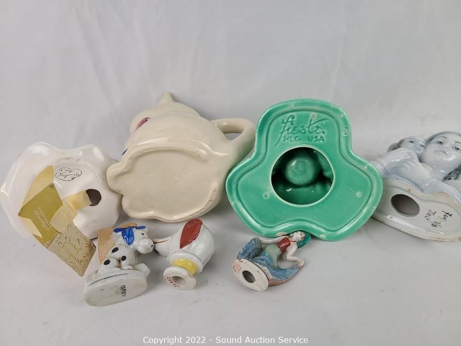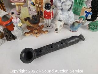 Lot Details: A few carved stone figures, pottery pipe, Fiesta candleholder, McCoy well vase, Josef original figure, and various other figures.