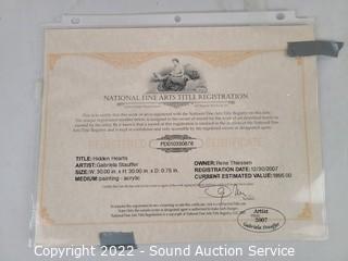 Lot Details:Hidden Hearts by Gabriela Stauffer. Comes with National Fine Arts Title Registration Refer to photos for signature, dated '07. 30" x 30". Painted on canvas.