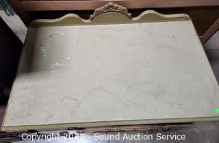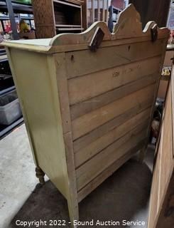Lot Details: Solid wood construction, dovetail joinery. Various wear to the finish, top has been damaged and painted, some cracking in places. Has a partial label, unable to make out. 42" H x 34" W x 20" D.