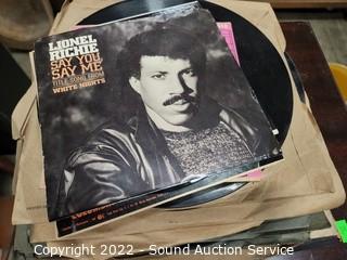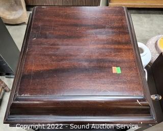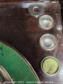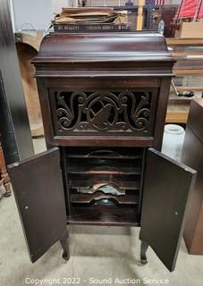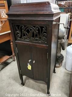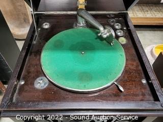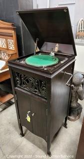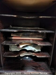 Lot Details: Appears to be in functioning condition. Needle arm has a break at base. Stained mahogany cabinet, some scratches & wear to the finish. Comes with some record. Refer to photos for some titles. 45" H x 18" W x 19" D.