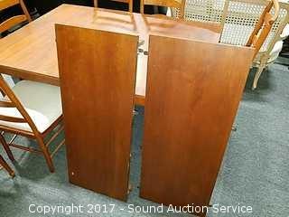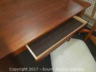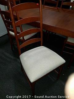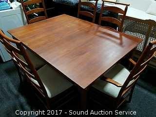 Has two silver cloth lined drawers built into the table on each end to store your fine flatware. Comes with 6 ladderback chairs, two captains chairs. In excellent condition. Beautiful grain. Comes with two 18" leaves. Approx. 29-3/4" tall, 62" long without the leaves and 44" wide. Is 98" long with both leaves.