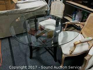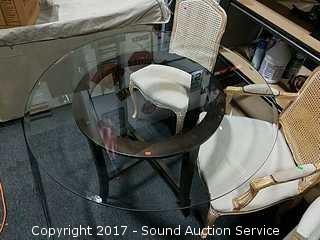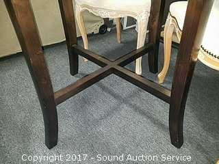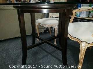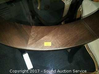Has a nice wooden frame. Approx. 29.5" tall, 48" diameter.