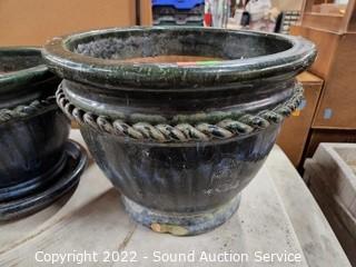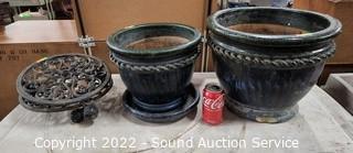 Lot #0255: 2 Glazed Pottery Planter Pots w/Rolling Stands