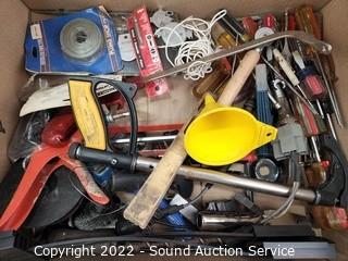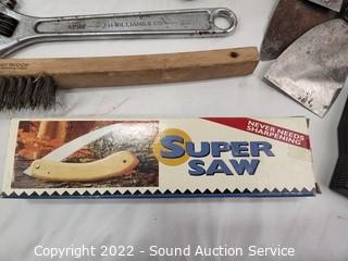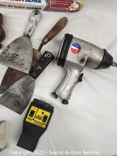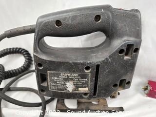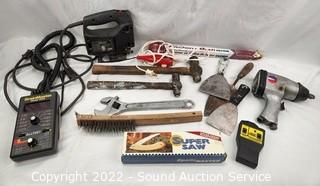 Lot Details: Sabre Saw, Brain Master, 1/2" Impact Wrench, Caulk Gun, Hacksaw, & other tools. Refer to photos for lot contents.